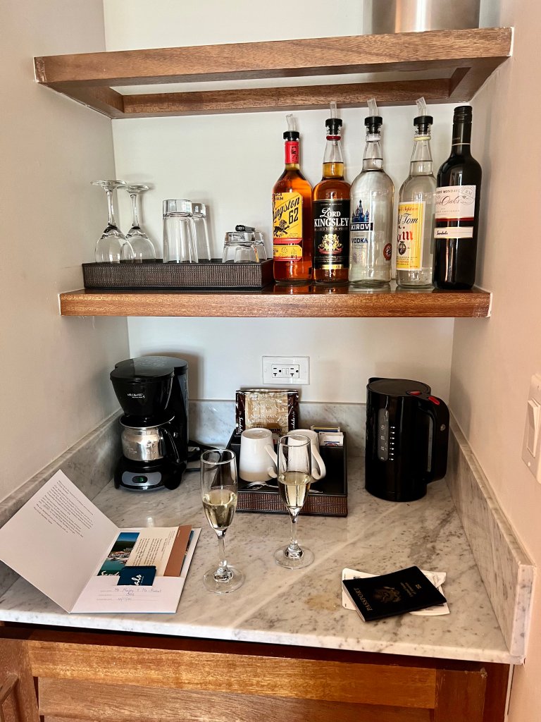 - In Room/Suite and Lounge bars with scotch, vodka, rum, whisky, wine, beer, juices, sodas and water.