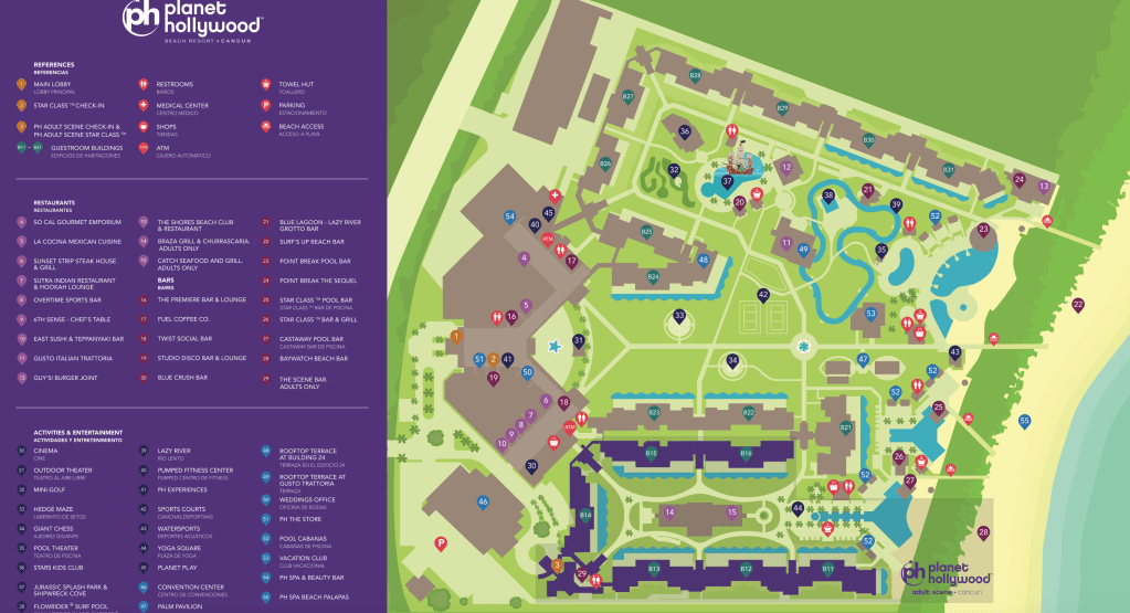 Resort map details out the Adults Scene to the far right of the resort grounds as well as the connected Planet Hollywood Resort amenities.